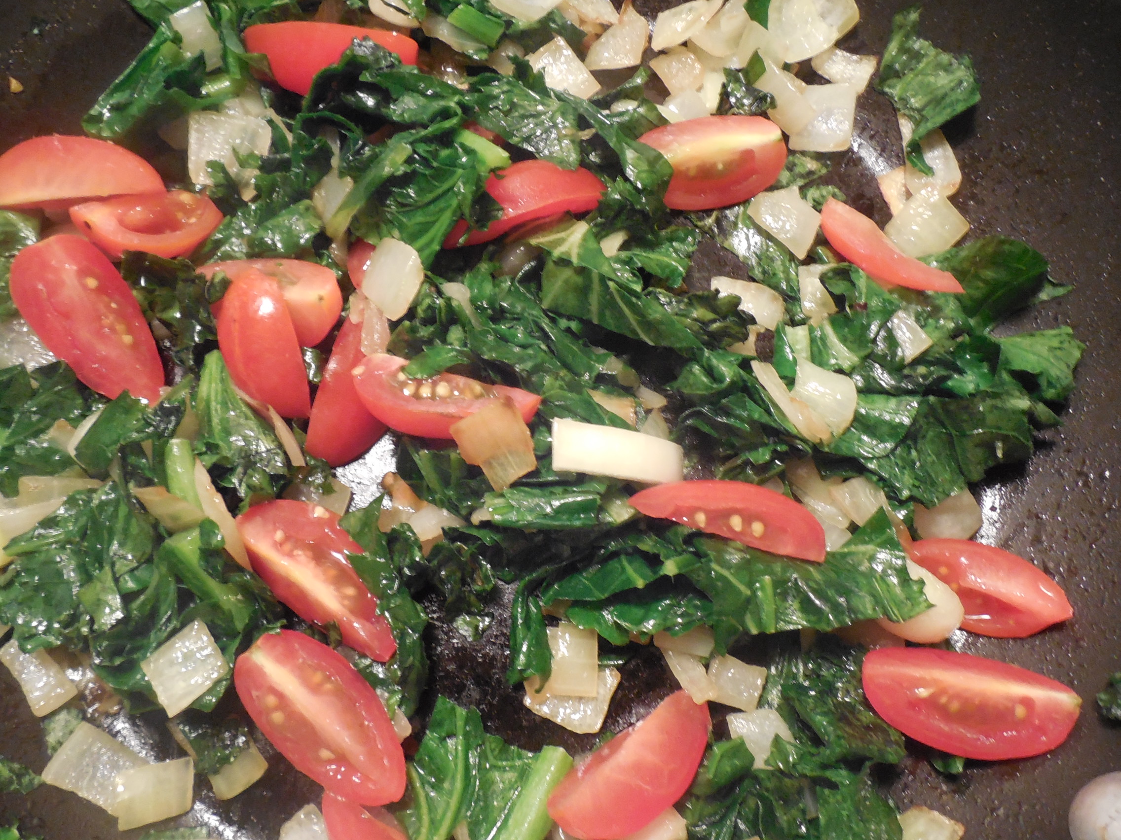 Wash the kale and tear it into pieces about the size of an egg. Saute the onions in some olive oil (or butter, if you want it to be really amazing), then wilt the kale and add the tomatoes. Sprinkle with a dash of kosher salt.