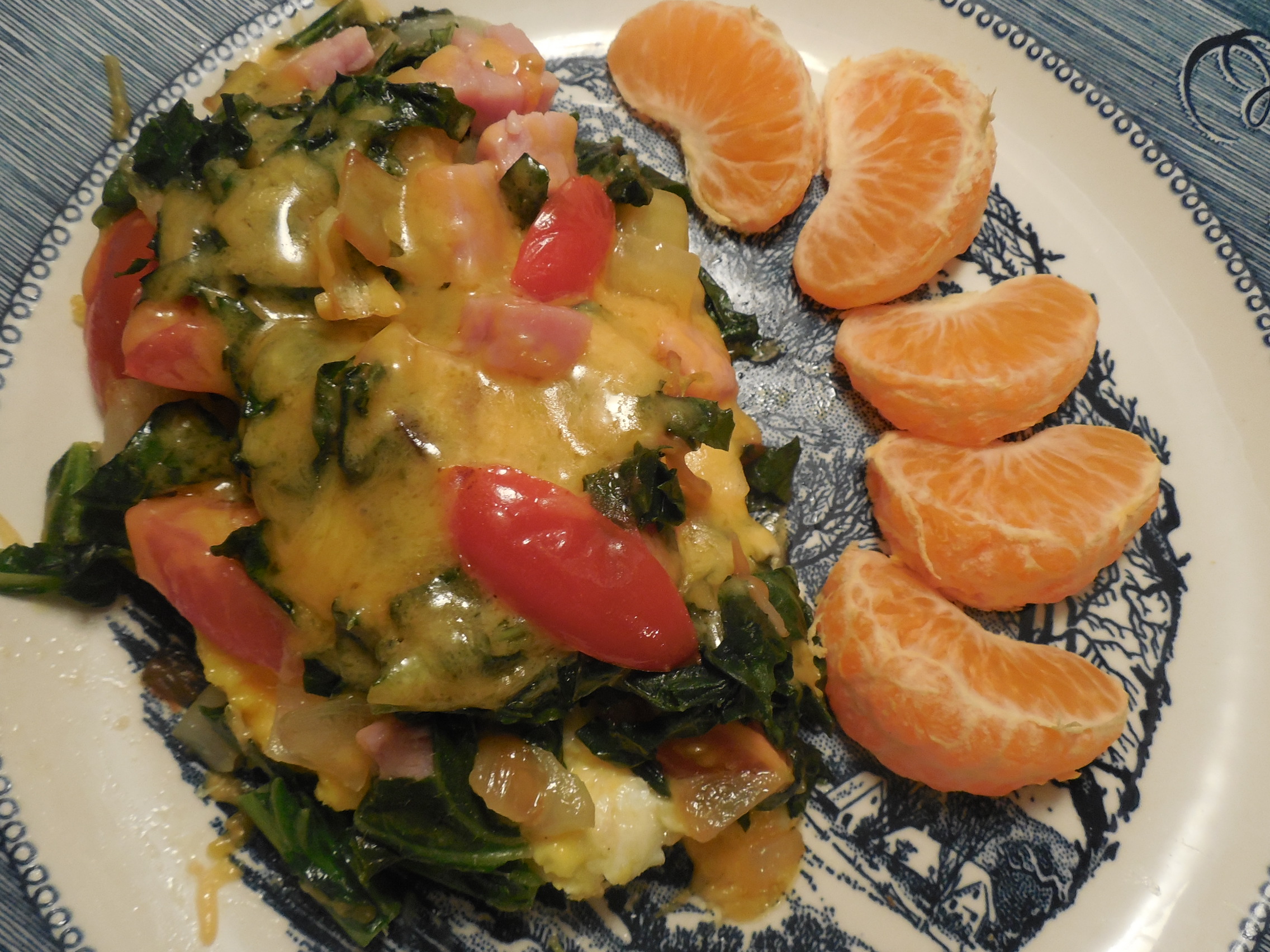 Layer the eggs, sauteed veggies, diced ham, and shredded cheddar. Let the cheese melt on low heat.