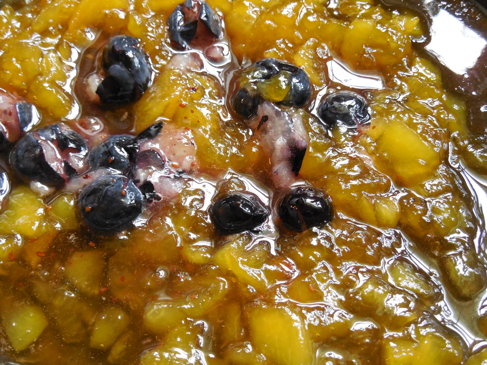 Full batch: 6 cups finely chopped peeled peaches, 2 cups blueberries, 3 cups sugar ( makes about 6 half pint jars)
