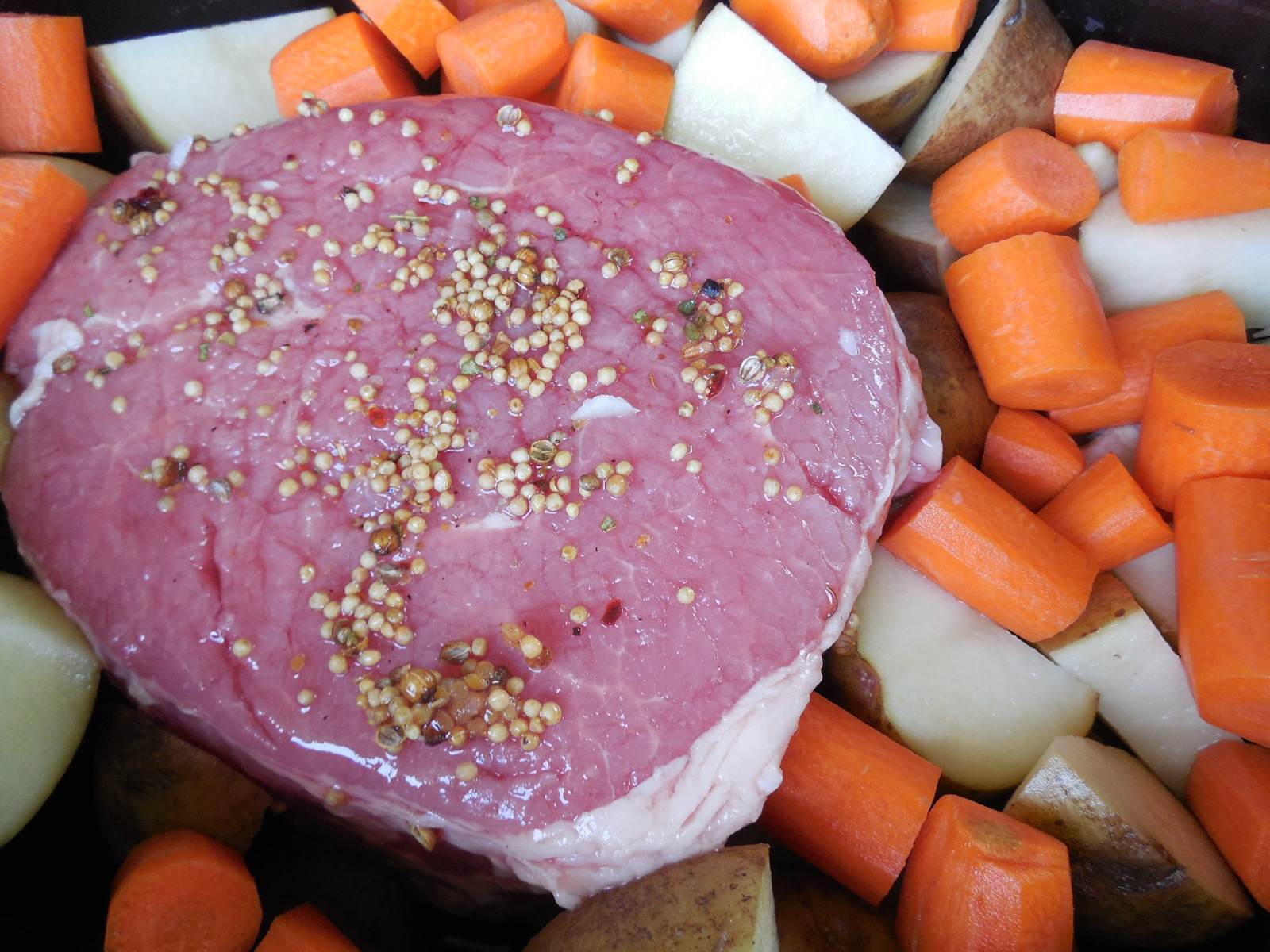 Simply place the beef, spices, and a few chunked carrots, potatoes, and onions into the Crock-Pot. Do not add water.