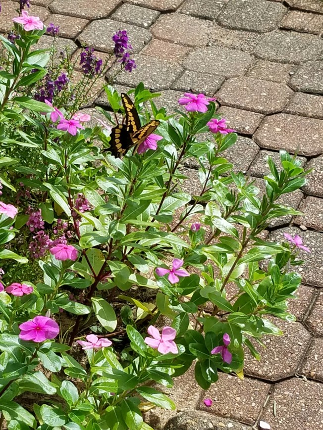 It was a two tier cake, and each tier had 3 layers. The bottom was 9″ in diameter, and the top was 6″ in diameter. I used a total of 4 batches of buttercream to crumb coat and frost the cake.
