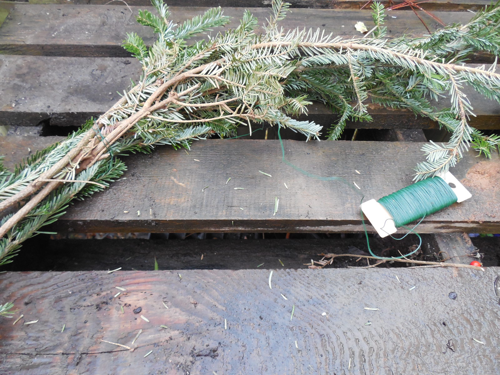 Add another branch every 8 inches, wrapping them securely with wire as you go. It won’t be very pretty, but this strand will be the base of your wreath.